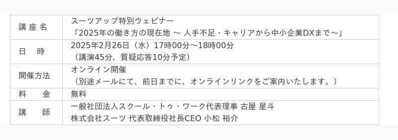 1.スーツアップ特別ウェビナー「2025年の働き方の現在地 ~ 人手不足・キャリアから中小企業DXまで~ 」概要