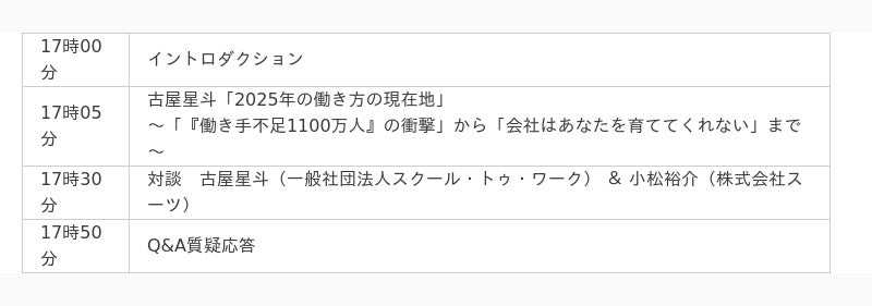 株式会社スーツ(所在地:東京都千代田区、代表取締役社長CEO:小松 裕介)は、2025年2月26日(水)17時から、ゲスト講師に、一般社団法人スクール・トゥ・ワーク代表理事の古屋 星斗氏を迎え、第3回となるスーツアップ特別ウェビナー「2025年の働き方の現在地 ~ 人手不足・キャリアから中小企業DXまで~」を無料開催します。