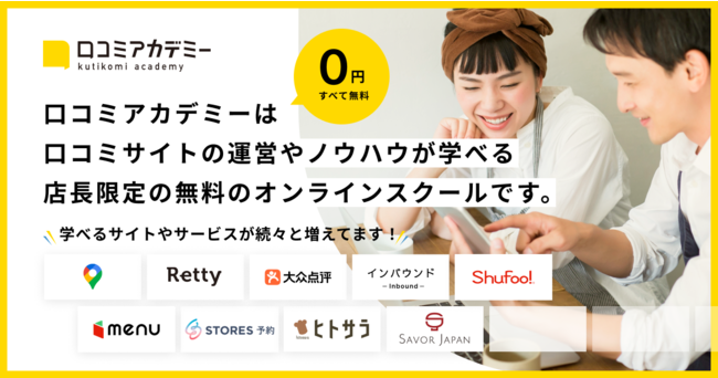 口コミアカデミーは、口コミサイトの運営やノウハウが学べる、店舗事業者限定の『無料』オンラインスクールです。