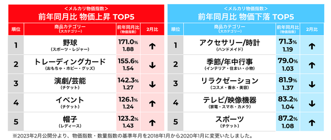 本ニュースレターでは、「メルカリ」の“中カテゴリー”に限定し、前年同月比で物価および数量指数が上昇、または下落した商品カテゴリーを紹介しています。