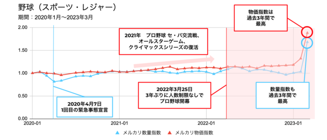 さらに2022年3月には、3年ぶりに人数制限なしでプロ野球が開幕。今年2月には新シーズンのオープン戦がスタート、3月に開催されたWBCでは、3大会ぶりに日本が優勝しました。連日、WBC等の野球関連ニュースが取り上げられたから、「メルカリ」上でも「野球」カテゴリーの物価・数量指数に影響したことが考えられます。