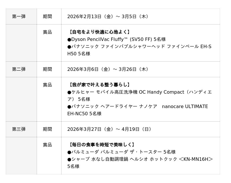 賞品には、掃除・美容・料理といった、新生活で負担になりやすい家事シーンを支え、日常の質を高めるアイテムをラインアップしています。