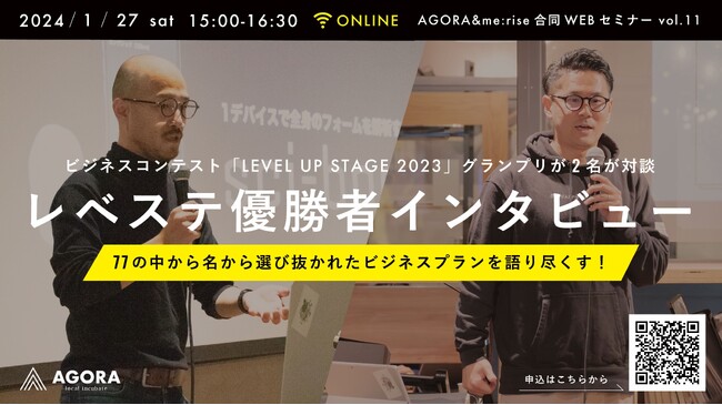 夢が加速する!ビジネスコンテスト「LEVEL UP STAGE 2023」グランプリ2名の対談が実現!1月27日(土)WEBセミナーにて「レベステ優勝者インタビュー」を開催@コワーキングオフィスアゴラ