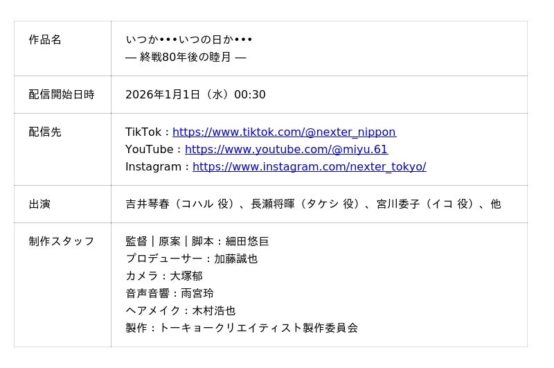 ネクスター社(本社:東京都新宿区、代表取締役CEO:細田 悠巨)グループの「 TOKYO creatist 」は、2026年1月1日、最新作となる縦型ショートドラマ『いつか・・・いつの日か・・・― 終戦80年後の睦月 ―』を公開しました 。 本作は、パワースポットとして知られる「東京のある神社」を舞台に、現代を生きる若者が、80年前の歴史に触れることで「今」という時間の価値を再発見していく物語です 。