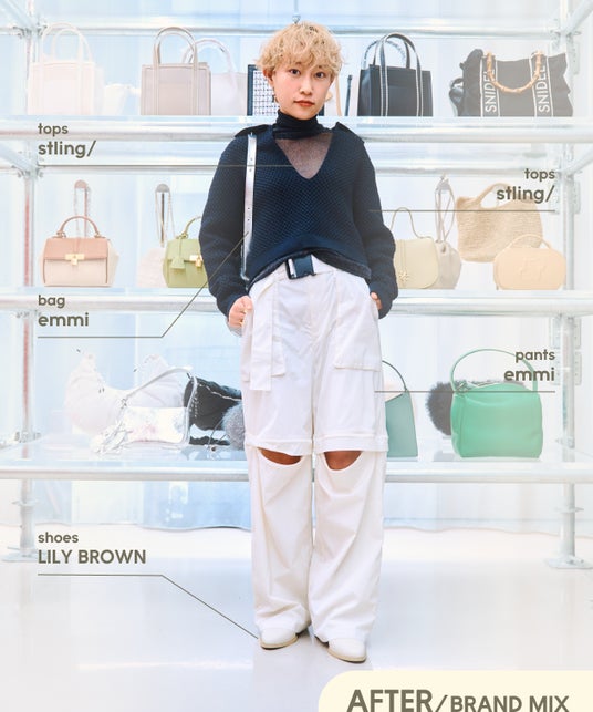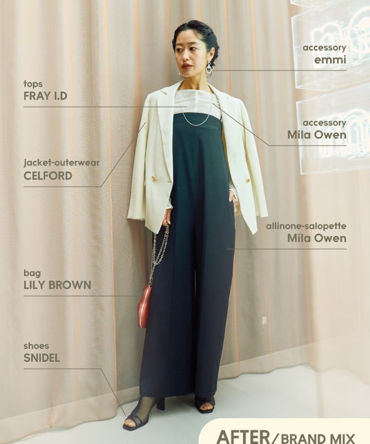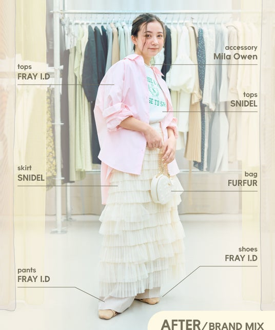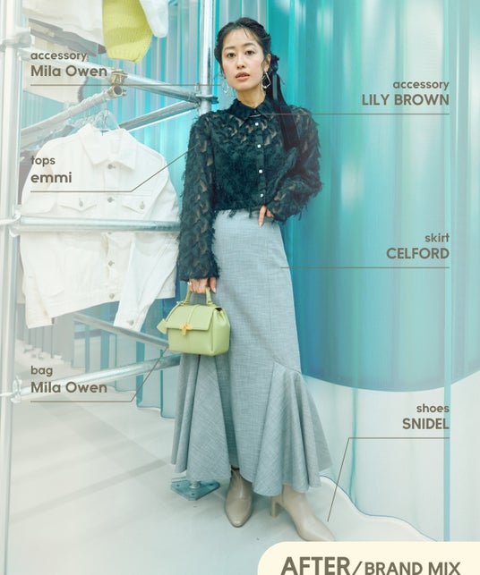 シアー素材は、ベーシックカラーを着る事が多かったのですが、カラーで組み合わせるスタイリングはフレッシュな気分になりました。シャツ×ビスチェのレイヤードスタイルは普段あまりしないので、こういったスタイリングの見せ方もあるのだと気付かされました。今後のスタイリングに取り込んでいきたいと思います。様々なスタイリングにチャレンジしようと思っても、同じブランド内で合わせるとどうしても決まったコーディネートになりがちなので、ブランドMIXすることでより幅が広がって面白かったです。他ブランドのアイテムの良さや興味が深まりました。