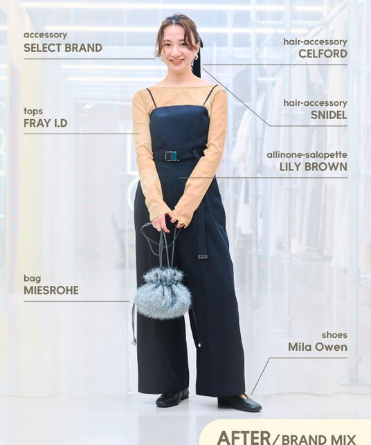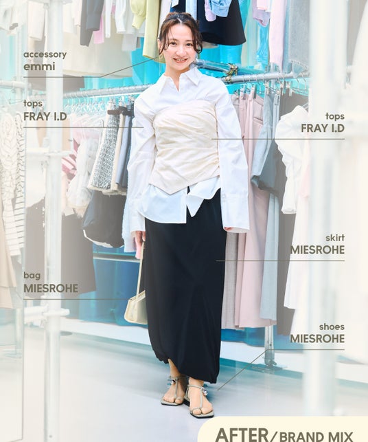 フォーマルなCELFORDのスカートに、ウェルネスライフスタイルブランドemmiのシャツを組み合わせたスタイリングが新鮮でした。普段はCELFORDのエレガントな服を中心に選んでいますが、他ブランドとのアイテムをMIXした今回の体験を通じてアイテムの選択肢が広がりました。同じブランドのアイテムで作るスタイリングだけではなく、他ブランドとMIXしたスタイリングの大切さに気付かされました。幅広いスタイリングの可能性を感じたので、これからはお客様に自分のブランドアイテムだけではなく、他ブランドアイテムとの組み合わせも含めた新しいコーディネート提案をしていきたいです。