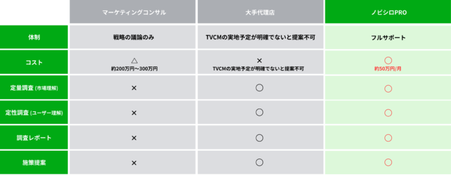 「ノビシロPRO」サービス概要「ノビシロPRO」はマーケティング戦略設計に多くの費用をかけることが難しいスタートアップや中小企業にこそご活用いただきたく、調査会社のパネルを使用した調査費も含めて月額50万円で提供します。