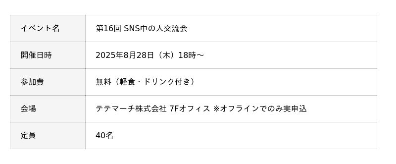 テテマーチ株式会社(本社:東京都目黒区、代表取締役:上田大介)は、企業SNS運用担当者向けイベント「SNS中の人交流会」の第16回を、2025年8月28日(木)に開催いたします。