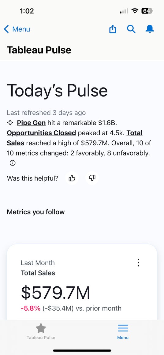 さらに詳しく:今年初めに発表されたTableau Pulseは、ビジネスユーザーが関心を持つ指標のドライバーやトレンド、貢献要因、異常値を自動的に検出し、