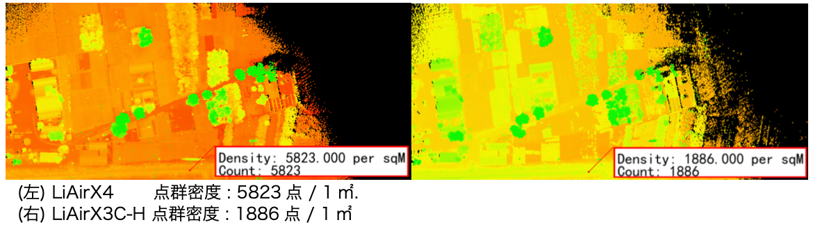 本製品は、従来モデル「LiAir X3C-H」の垂直視野角40.3°から270°へと大幅に拡大(従来比6倍以上)した新モデルです。点群データの密度も従来比約3倍に向上しており、より高密度な3Dマッピングが可能になりました。実測では、LiAir X3C-Hが1平方メートル あたり1,886点だった点群密度に対し、LiAir X4では1平方メートル あたり5,823点を記録しました。これにより、一度の飛行でより詳細な地形や構造物の形状を把握でき、精密な解析・設計業務への応用が可能です。DJI社製「Matrice 300 RTK」および「Matrice 350 RTK」に対応し、ドローンを用いた高精度な3Dデータ取得を効率的に行うことができます(ドローン本体は別売)。