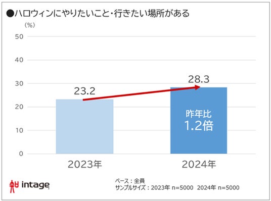 はじめに、今年のハロウィンの予定について聴取しました。「やりたいこと・行きたい場所(以下、予定)がある」と回答した人は全体の28%で、昨年(23%)の1.2倍となりました(図表1)。