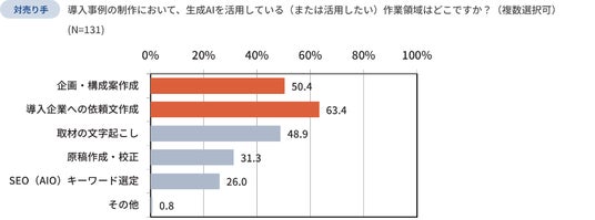 生成AIが作成したことが感じられるテキストについて、買い手の52.9%が「抵抗感がある」と回答しました。一方で、制作現場では「導入企業への依頼文作成(63.4%)」や「構成案作成(50.4%)」などでAI活用が進んでいます。売り手はAI活用によって生産性を高めつつ、最終的なアウトプットにおいて買い手の抵抗感を払拭する工夫が求められていると言えるでしょう。