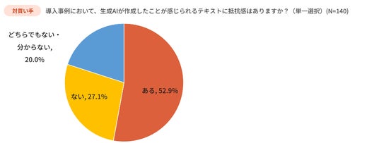 - 生成AIが作成したことが感じられるテキストに対し、過半数の52.9%が「抵抗感がある」と回答。効率化と信頼性のバランスが課題に。