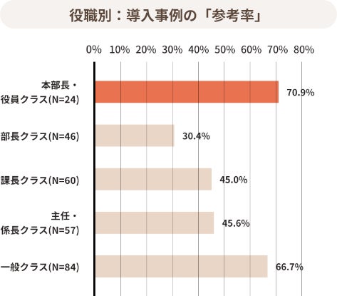 - 役職別の閲覧率では、「本部長・役員クラス」が70.9%と最も高く、経営層ほど導入事例を意思決定の参考にしている実態が判明。