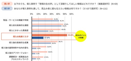 事例の中で「現場の生の声として深掘りしてほしい情報」を聞いたところ、買い手は「導入の失敗リスク(53.6%)」を最も求めました。対して、売り手が伝えたい情報として「失敗リスク」を選択した企業はわずか17.6%に過ぎません。買い手は「失敗しないための防衛策」を求めているのに対し、売り手は「成功した輝かしい結果」のアピールに終始していることが分かります。