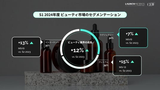 レポートハイライト2024年度上半期 ビューティ市場のセグメント別概要2024年上半期のビューティ市場全体のMIV(R)*は前年同期比で+12%と成長しており、中でも最も伸びたセグメントはプレミアムブランド領域であることが明らかになりました。これは、ビューティ市場全体のMIV(R)*が順調に成長している中で、プレミアムブランドの競争が激化し、ブランドのマーケティング予算が最も増加していることの裏付けとなります。