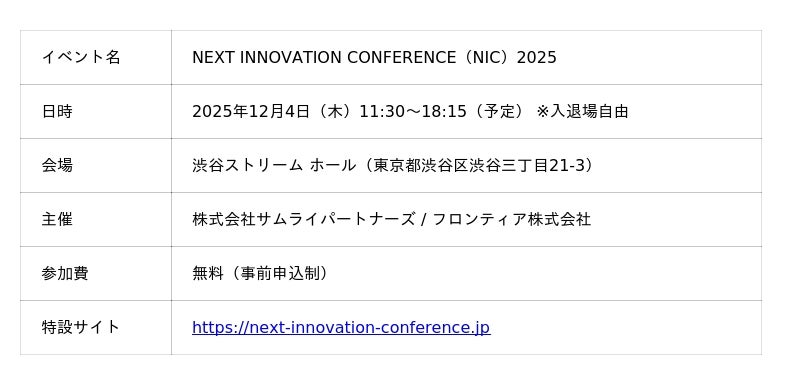 ビジネスマッチングサービス「Ready Crew(レディクル)」を運営する、フロンティア株式会社(本社:東京都渋谷区、代表取締役社長:高橋 政裕、以下 当社)は、株式会社サムライパートナーズ(本社:東京都千代田区、代表取締役CEO:入江 巨之)と、2025年12月4日(木)渋谷ストリーム ホールにて『NEXT INNOVATION CONFERENCE(NIC)2025』を共同開催いたします。