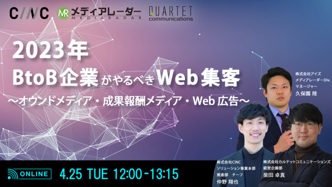 株式会社CINC(シンク、以下CINC)は、2023年4月25日(火)に株式会社アイズ・株式会社カルテットコミュニケーションズとオンラインセミナー『2023年BtoB企業がやるべきWeb集客 ~オウンドメディア・成果報酬メディア・Web広告~』を開催いたします。