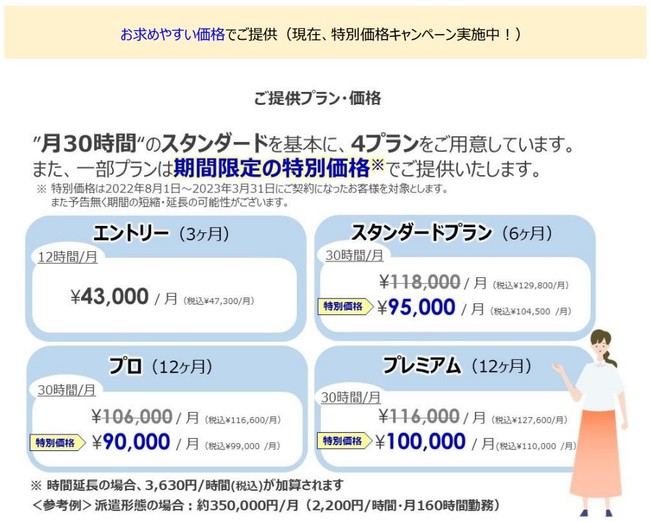 お受けする業務は、あらゆるバックオフィス業務を対象としております。人手不足・スキル不足となっている業務(営業事務、経理等)に対し、必要なパーツごとに時間単位で柔軟にご利用いただくことが可能であり、お求めやすい価格で“価値あるサポート”を提供いたします。