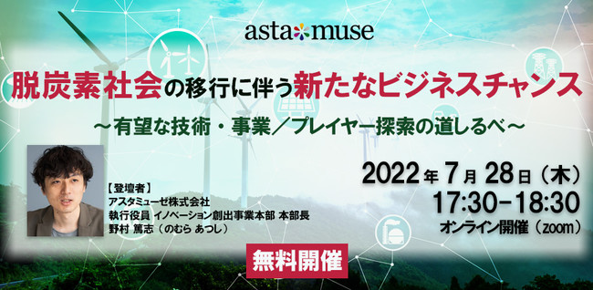 アスタミューゼ株式会社(本社:東京都千代田区、代表取締役社長 永井歩)は、2022年7月28日(木)17:30~18:30に、業界を問わず、カーボンニュートラルを推進されている方(R&D、オープンイノベーション/M&A、事業部、サステナビリティ推進、経営企画等)を対象とした無料ウェビナー「脱炭素社会の移行に伴う新たなビジネスチャンス ~有望な技術・事業 / プレイヤー探索の道しるべ~」を開催いたします。
