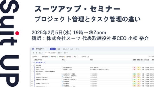 株式会社スーツ(所在地:東京都千代田区、代表取締役社長CEO:小松 裕介)は、2025年2月5日(水)19時から、当社代表の小松が講師を務めるスーツアップ・セミナー「プロジェクト管理とタスク管理の違い」を無料開催します。