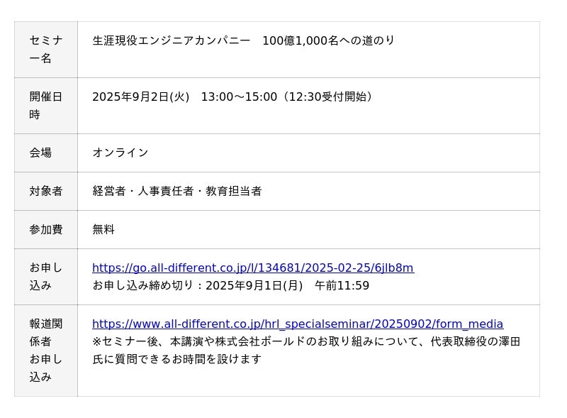累計20,000社450万人以上の組織開発・人材育成を支援するALL DIFFERENT(オールディファレント)株式会社(所在地:東京都千代田区 代表取締役社長:眞崎大輔)は、スペシャルセミナーを9月2日(火)に開催いたします。本講演では、IT業界の変革をリードする