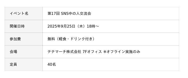 テテマーチ株式会社(本社:東京都目黒区、代表取締役:上田大介)は、企業SNS担当者向けの人気イベント『SNS中の人交流会』第17回を、2025年9月25日(木)にオンラインで開催いたします。