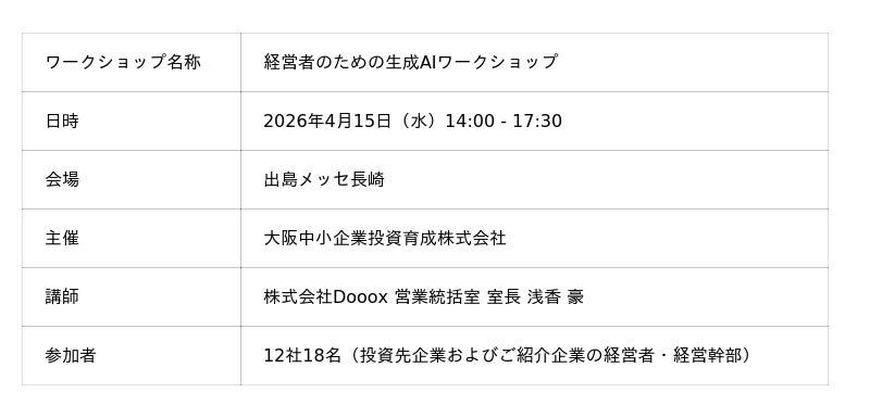 『緊急ではないけれど、重要な課題』について、企業経営者に伴走する特命社長室を展開する株式会社Dooox(本社:東京都品川区、代表:久保寺亮介/以下「当社」)は、2026年4月15日(水)、大阪中小企業投資育成株式会社(本社:大阪市北区、代表:小林 利典)との共同開催により、出島メッセ長崎にて「経営者のための生成AIワークショップ」を実施いたしました。投資先企業およびご紹介を受けた企業を含む12社18名の経営者・経営幹部が参加し、3.5時間にわたり最新の生成AIツールを自ら操作しながら、経営課題の解決に向けたワークに取り組みました。