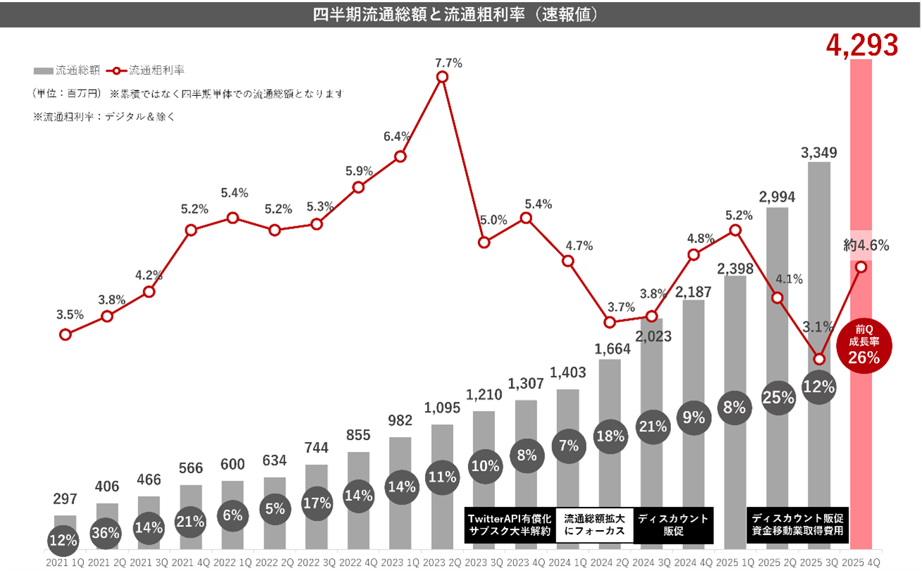 2025年9月期第4四半期においては前四半期対比126%、四半期流通総額40億円を突破いたしました。流通総額1,000億達成に向けて、「3万円以下のto C現金支払い」を、1.広告領域 2.人材領域 3.金融領域の3軸にて網羅を目指してまいります。各領域における取り組みを強化し、中期目標である2027年9月期に掲げている流通総額1,000億円を達成することで、圧倒的低手数料を実現し、より多くの企業様にご利用いただけるよう、更に邁進してまいります。