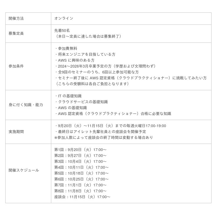 本セミナーは昨年初めて開催し、参加者から AWS 認定資格合格者を10名以上輩出した実績があります。アイレットは 本セミナーを通じ、AWS の概要やユースケースなどの AWS の基礎知識を習得する機会を学生に提供することで、クラウドエンジニアを目指す学生の就職活動を支援してまいります。