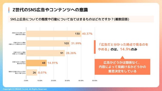 Z世代は広告嫌いと言われることも多いが、興味を持てる内容か?でSNS広告を視聴するかどうかを決める人ほとんどということがわかる。