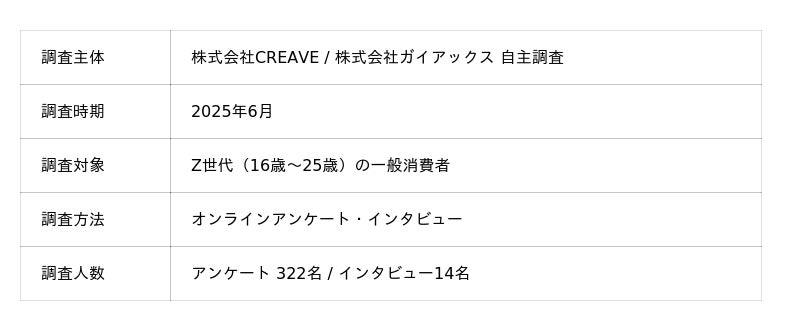 クリエイターとの共創を通じて企業のマーケティング課題を解決する、株式会社CREAVE(本社:東京都千代田区、代表取締役社長:中村真奈、以下 CREAVE)は、株式会社ガイアックスと共同で2025年7月22日(火)に『Z世代のSNS毎の使われ方が明らかに!Z世代の意識・SNS購買行動調査レポート』を公開いたしました。