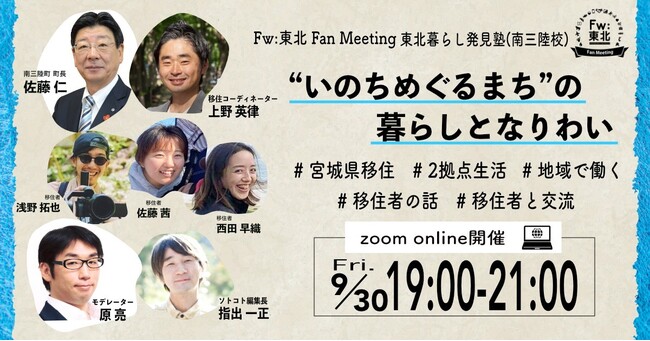 エイチタス株式会社(本社:東京都品川区、代表取締役:原 亮/小澤 剛)は、復興庁主催のワークショップ「Fw:東北(フォワードとうほく) Fan Meeting」にて、「東北暮らし発見塾(南三陸校)~“いのちめぐるまち”の暮らしとなりわい」の企画運営を行い、9月30日夜に無料のZoomミーティングを開催します。