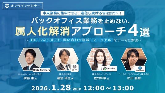 コミュニケーションプラットフォーム『Re:lation(リレーション)』を提供し、6,000社以上(※1)の導入実績を誇る株式会社インゲージ(本社:大阪府大阪市、代表取締役社長:和田 哲也)は、2026年1月28日(水)、Unite Partners株式会社、株式会社識学、コニカミノルタジャパン株式会社との4社共催によるオンラインセミナー「本来業務に集中できる、進化し続ける管理部門へ!バックオフィス業務を止めない、属人化解消アプローチ4選」を開催することをお知らせいたします。