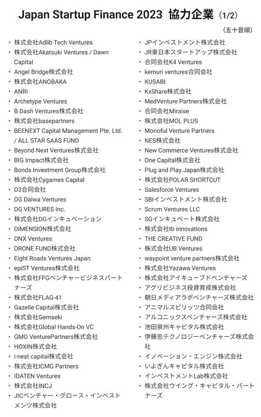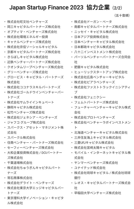 レポート制作にご協力いただいた投資会社一覧本レポートでは、公開情報だけでは即時取得できない情報範囲において、ベンチャーキャピタルをはじめとする投資会社の皆様に「投資アンケート」をお願いしています。今回は、過去最多となる136社にご協力いただきました。