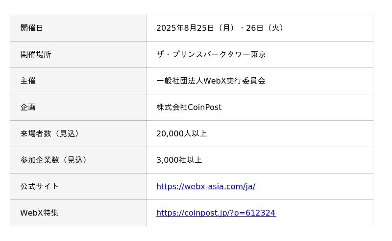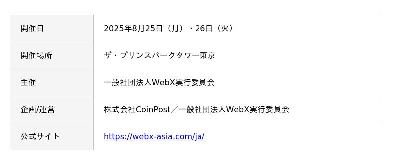 国内最大手のWeb3メディア「CoinPost」の運営会社、株式会社CoinPost(本社:東京千代田区、代表取締役CEO:各務貴仁)が企画・運営し、一般社団法人WebX実行委員会が主催する国際Web3カンファレンス「WebX」において、石破内閣総理大臣の登壇が決定したことを発表いたします。