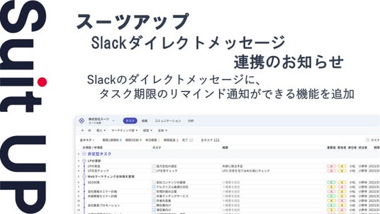 今般、当社では、スーツアップが、当該機能において、ビジネス・チャットツール「Slack」(スラック)のダイレクトメッセージにタスク期限の通知ができる機能を追加したことをお知らせします。