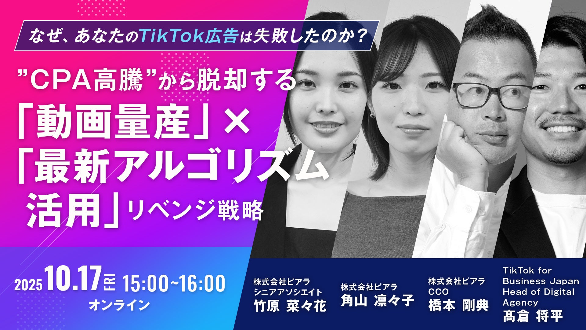 当社はTikTok for Businessと共催で、2025年10月17日(金)に新規ユーザーの獲得にご興味のある経営者・役員・役職者・マーケティングご担当者を対象とした無料オンラインセミナーを開催いたします。