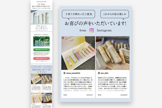 ドモホルンリンクルでは、「お客様の声は企業の資産である」とUGCの重要性を認識していましたが、お客様から収集したレビューをはじめとするUGCはサイト上への一部掲載にとどまり、これを顧客獲得効率向上のために運用・最適化することが十分にできていませんでした。そこでLetroを活用して、ドモホルンリンクルの新規獲得用LPと既存顧客引き上げ用の「私がドモをはじめた理由」のページにUGCを掲載し、運用を開始しました。 新規獲得用LPでは、Instagramに投稿されたUGCを掲載。お客様からの喜びの声として、「ドモホルンリンクルをはじめたきっかけ」や「使用した際の感動体験」が表現されたInstagram投稿を掲載し、CTRやCVRをはじめとする定量データや、UGCから見えてくる顧客インサイトをもとに、UGCの掲載位置や表示するUGC、UGC上部のバナーの運用を行うことでCVR1.51倍を実現することができました。