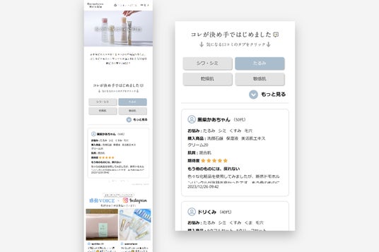 また、既存顧客引き上げ用の「私がドモをはじめた理由」のページにおいては、「ドモホルンリンクルを初めて購入した決め手」や、「これからのお手当てへの意気込み」などが表現されたUGCを掲載。レビューにおいては、知りたい情報がすぐ見れる仕掛けとして、「肌悩み」や「購入商品」など主要カテゴリーをタブで表示するだけでなく、掲載するレビューも使用背景、使用感がわかるものを積極的に選ぶことで、共感を醸成することができ、離脱率8%減、ログイン率8.2%上昇という実績を記録しました。