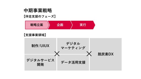 メンバーズでは、2024年5月より中期事業戦略を掲げ、取引先企業のDX投資のROI最大化を実現するDX現場支援の確立を目指しています。支援事業領域を、制作/UIUX、デジタルマーケティング、デジタルサービス開発、データ活用支援、脱炭素DXとし、サービスを抜本的に強化するとともに、これまで集中して提供してきた「実行」フェーズでの大手企業を中心に1,000社を超える実績を活かしながら、ニーズが拡大しているDXの企画・推進や内製化といった「企画」フェーズにおけるサービスにも注力し、各フェーズにおいて取引先企業に伴走支援するポジションを獲得していきます。