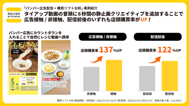 先日『DELISH KITCHEN』アプリにて、ポッカサッポロフード&ビバレッジ株式会社の「ポッカレモン100」のプロモーションとして「バンパー広告配信+購買リフト分析」プランを実施しました。既存のタイアップ動画である「餃子のアレンジたれ3選」の冒頭に6秒間の静止画クリエイティブを追加。カウントダウンを入れることで自然にレシピ動画の視聴へつなげることができます。