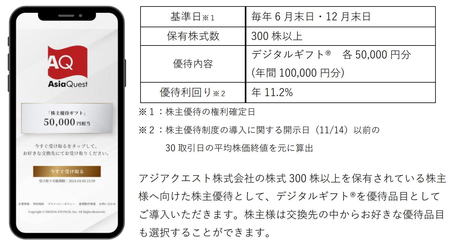 アジアクエスト株式会社(代表取締役社長:桃井 純、東証グロース市場:証券コード4261)において、株式会社デジタルプラス(代表取締役社長:菊池 誠晃、本社:東京都渋谷区、東証グロース市場:証券コード3691)グループが運営する「デジタルギフト(R)」を株主優待としてご活用いただくことになりました。