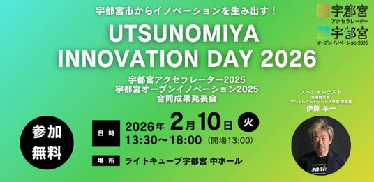 宇都宮イノベーションコンソーシアム(事務局:宇都宮市)は、2026年2月10日(火)に「宇都宮アクセラレーター2025」および「宇都宮オープンイノベーション2025」の合同デモデイとして、「UTSUNOMIYA INNOVATION DAY 2026(UID2026)」を開催いたします。