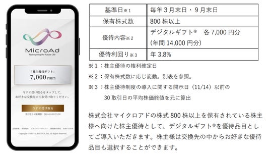 株式会社マイクロアド(代表取締役 社長執行役員:渡辺 健太郎、東証グロース市場:証券コード9553)において、株式会社デジタルプラス(代表取締役社長:菊池 誠晃、本社:東京都渋谷区、東証グロース市場:証券コード3691)グループが運営する「デジタルギフト(R)」を株主優待としてご活用いただくことになりました。