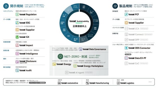 *1 サステナビリティERP「booost Sustainability」は、自社およびサプライヤーのサステナビリティ関連財務情報を管理する“統合型SXプラットフォーム”です。国際開示基準に準拠した環境、社会、ガバナンス等の1,200以上のデータポイントに対応したサステナビリティ関連情報の収集、集計を自動化し、リアルタイムでのモニタリングを可能にします。グローバルに対応したデータガバナンス機能を搭載しており、グループやサプライチェーンを含む組織において多階層の承認フローの実装が可能であるほか、第三者保証等にも対応すべく設計したプラットフォームであり、サステナビリティ関連情報の開示に向けて発生する各業務を効率化・最適化する機能をフェーズ毎に包括的に提供しています。