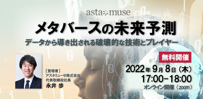 アスタミューゼ株式会社(本社:東京都千代田区、代表取締役社長 永井歩)は、2022年9月8日(木)17:00~18:00に、「未来推定」の手法により導出したメタバース領域で伸びる技術やプレイヤーについて解説する無料ウェビナー「メタバースの未来予測 ~データから導き出される破壊的な技術とプレイヤー~」を開催いたします。
