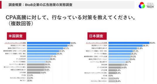 IDEATECHの独自調査では、米国企業も日本企業も共に、CPAの高騰化の対策としてコンテンツマーケティングに取り組んでいる企業が多いことを明らかにしています。