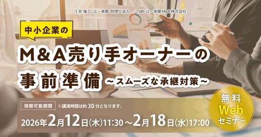 辻・本郷 税理士法人(本社:東京都新宿区、理事長:桑木小恵子)は、SBI 辻・本郷M&A株式会社(本社:東京都千代田区、代表取締役:小林堅悟)と共催で、2026年2月12日(木)より「中小企業のM&A売り手オーナーの事前準備~スムーズな承継対策~」セミナーを開催いたします。