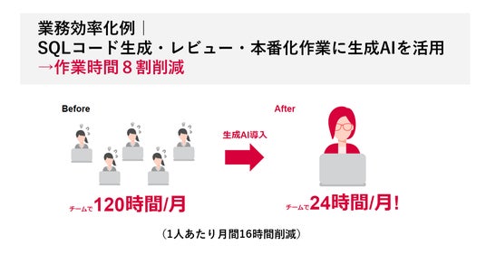 - - データベース検索に使うSQLのコード生成、レビュー、本番移行の作業に、生成AIを活用。データの抽出・集計・本番移行までの一連業務にかかる時間を月120時間から24時間までに短縮。作業時間の8割削減を実現。